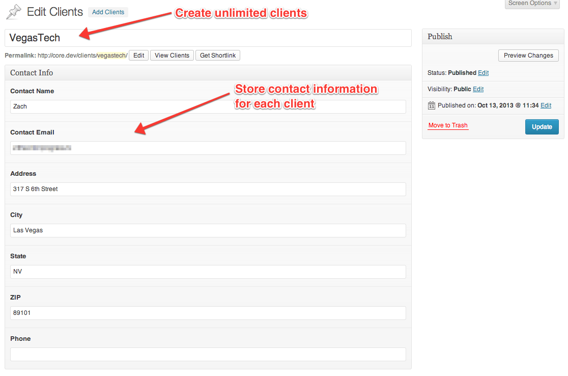 - Clients are now stored as a custom post type allowing you to store contact information for each client.